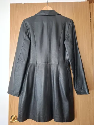 Chaqueta de cuero estilo tres cuartos. - Diseño elegante y atemporal. - Cierre con botones. - Bolsillos frontales y uno interior. - Cuello solapa. -Entallada en la cintura. -Piel ovino