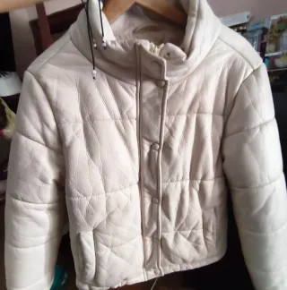 Preciosa chaqueta de cuero en color blanco roto. Es una prenda elegante y atemporal, perfecta para cualquier ocasión. - Talla: (Añadir talla)M - Corte: Ajustado - Material: Cuero genuino - Cierre: Cremallera - Bolsillos: Dos bolsillos delanteros