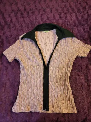 Elegante chaqueta de vestir de la marca Cacharel. Presenta un diseño con cremallera frontal y cuello - Tejido con textura y patrón geométrico. - Manga corta.