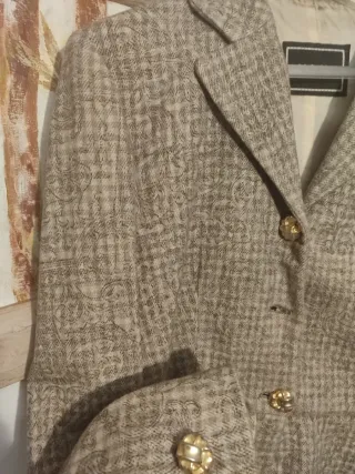 Elegante chaqueta con un estampado sutil y detalles dorados. Está bien cuidada. Hay que coserle un botón que lo doy a parte. - Diseño de corte clásico. - Botones frontales y en puños. - Forro interior. - Estampado damasco.