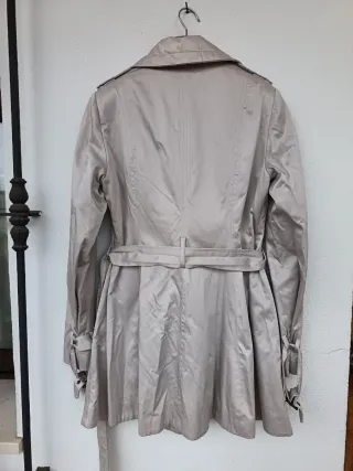 Elegante gabardina de Stradivarius en color beige. Medidas: Ancho 39cm / largo 80cm - Diseño de doble botonadura. - Cinturón ajustable a juego. - Cuello con solapa. - Puños con detalle de botón.