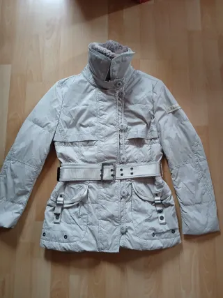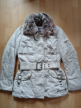 Elegante chaqueta acolchada Peuterey resistente al agua, color blanco hielo, talla 42 (italiana) 38 EU. Cuello de pelo en tonos burdeos desmontable. Cierre con doble cremallera y botonadura. Contiene dos bolsillos interiores, uno con cremallera. Incluye cinturón a juego para ajustar la silueta.