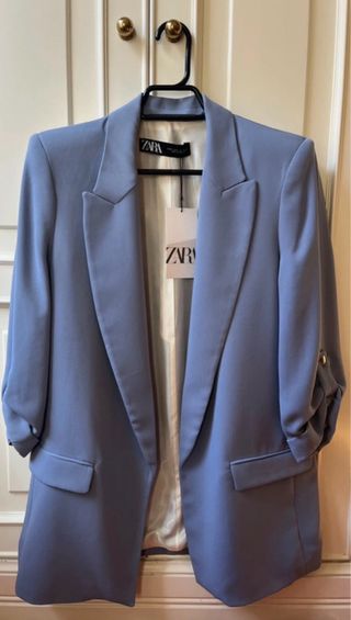 Elegante chaqueta de Zara en un bonito tono azul pastel. Talla M Largo: 75 cm Pecho: 52 cm Hombros: 40 Largo manga: 46cm con detalle de botón para recoger bajo codo Sin estrenar
