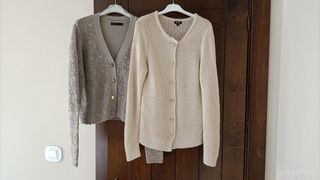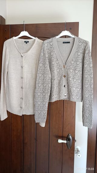 Conjunto de dos chaquetas de punto fino, perfectas para añadir un toque elegante a tu vestuario. - Una chaqueta de punto liso en tono beige claro con botones plateados. 4x4 - Otra chaqueta con un intrincado diseño de ochos y calados en color grisáceo. Botones dorados. Escote en V y marca Mohito. Talla S. - Ambas chaquetas pueden valer para una talla M ENVÍO SOLO POR EMPRESA CORREOS, no dispongo de otros servicios en mi zona.