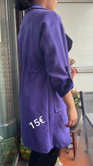 Preciosa chaqueta de ante sintético, color morado. Es de talla única, aunque se adapta a diferentes tallas. - Diseño elegante y versátil. - Cierre con cordón en la cintura. - Bolsillos funcionales. - Mangas 3/4 con puños. - Tejido suave y agradable al tacto.