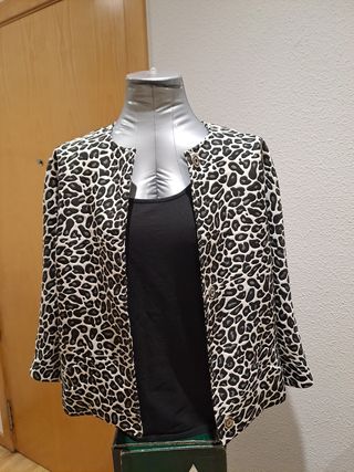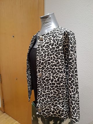 Elegante chaqueta con estampado animal print. - Diseño de manga larga. - Cierre con botones dorados. - Cuello redondo.
