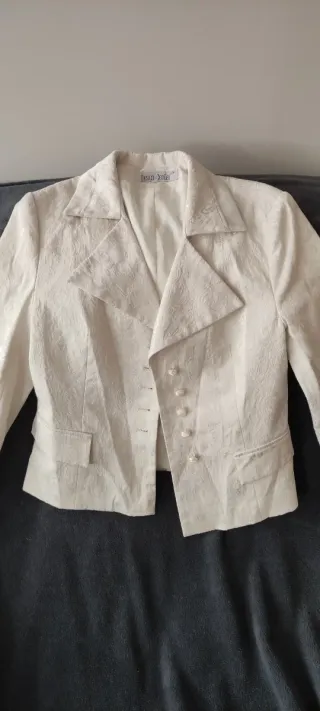 Elegante chaqueta de ceremonia en color blanco roto. - Tejido con relieve floral. - Cierre de botones nacarados. - Bolsillos faldos frontales. - Cuello solapa. Unas minúsculas salpicaduras enla solapa, ver fotos y hacer zoom, quizás salen con el lavado adecuado. , por eso el precio. Hago envios.