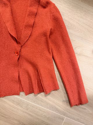 Elegante chaqueta corta con un vibrante tono naranja. Su diseño texturizado le da un toque especial. - Cierre con trebillas ocuktas. - 2 Bolsillos frontales superiores y otros 2 bolsillos falsos - Mangas ligeramente abullonadas. Talla 40 chaqueta corta: 53 cm desde costura superior hombro anchura inferior 48 cm de lado a lado Usada, pero en muy buen estado. Tejido de calidad.