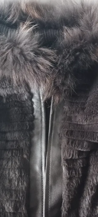 Chaqueta elegante que combina punto y piel. - Diseño con capucha de pelo. - Cierre de cremallera. - Bolsillos con cremallera.