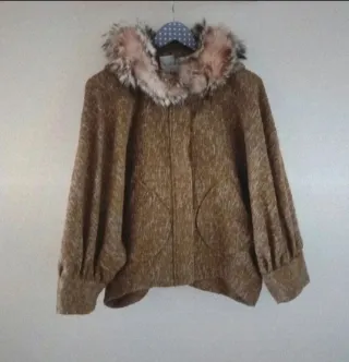 Chaqueta amplia de tweed con un diseño moderno y elegante. Perfecta para añadir un toque especial a tu look, cierre con cremallera y botones, detalle de pelo en el cuello, bolsillos delanteros, mangas abullonadas.