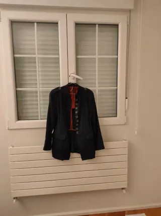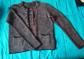 Chaqueta de punto con un diseño moderno y elegante. -Talla S pero da para M -Detalle calado en las mangas. - Cierre de botones. - Tejido suave y confortable.