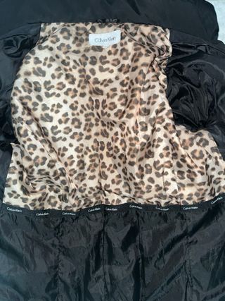 Chaqueta elegante con un llamativo forro interior. Chaqueta Calvin Klein De mujer con capucha totalmente negra por la parte de afuera, viene con bastantes bolsillos en la parte adentro y con toque guepardo también, la cremayera en la parte de abajo está rota, solo con un pequeño cambio la tienes arreglada Es gruesa y bastante pesada perfecta para el frío - Diseño reversible. - Bolsillos interiores y exteriores. - Cierre de cremallera. - Cuello alto.