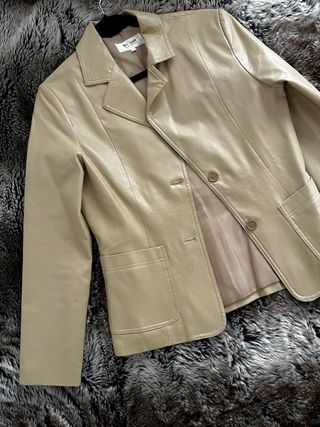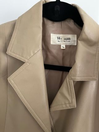 Blazer de piel sintética (PVC) de la marca Woman by Carla Rizzi. Color camel/beige muy combinable y elegante. Corte estructurado con solapas y bolsillos delanteros. Estado: Muy poco uso, como nueva. El forro interior está impecable. Talla: Marcada como 38/40 (equivale a una M). Material: Exterior 100% PVC (efecto cuero), interior forrado 100% poliéster. Cuidados: Se limpia fácilmente con un paño húmedo. No necesita tintorería. Ideal para looks de oficina o para darle un toque chic a unos vaqueros. ¡Hago envíos rápidos!