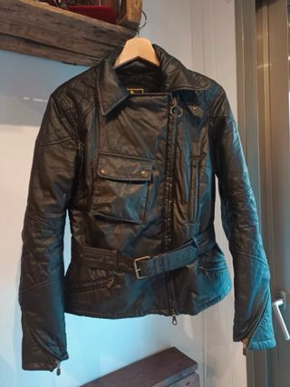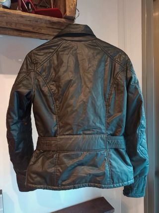 Chaqueta de algodón encerado con un diseño clásico y elegante. Talla como una L. - Cuello estilo motorista. - Cinturón ajustable a la cintura. - Bolsillos frontales con solapa. - Cremalleras en los puños.