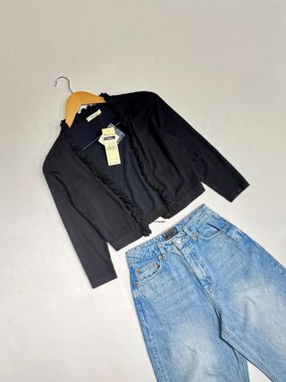 Elegante chaquetita negra con un delicado detalle de volantes. - Diseño corto y moderno. - Manga larga. - Cierre frontal abierto.
