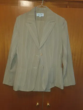 Conjunto de chaqueta y pantalón para mujer con un diseño de rayas verticales. - Chaqueta con solapas y cierre de botón. - Bolsillos frontales con solapa. - Pantalón a juego. Talla 40