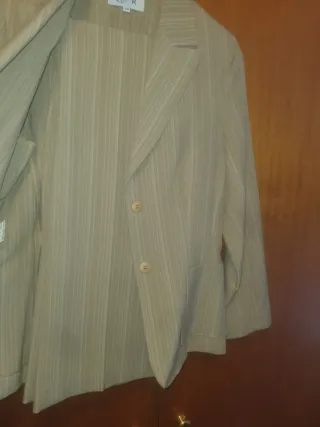 Elegante conjunto de chaqueta y pantalón. - Chaqueta con cierre de dos botones. - Diseño de rayas verticales finas. - Bolsillos frontales en la chaqueta.
