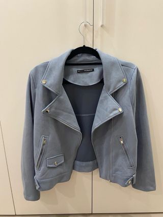 Chaqueta de estilo motorista en tono azul suave. - Cierre de cremallera asimétrico. - Bolsillos con cremallera. - Detalle de solapa. - Puños abotonados.