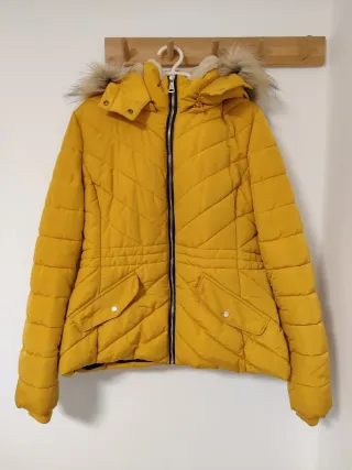 Chaqueta acolchada de color amarillo con detalles modernos. - Capucha con pelo. - Cierre de cremallera. - Bolsillos frontales con solapa y botón.