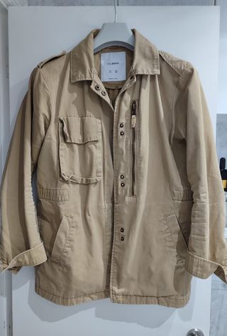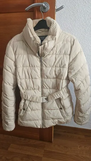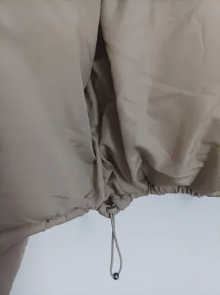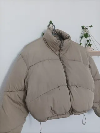 Chaqueta acolchada de corte moderno y color beige en muy buen estado. - Diseño corto. - Cuello alto. - Cierre de cremallera. - Cordones ajustables en el bajo. - Bolsillos con forro polar.