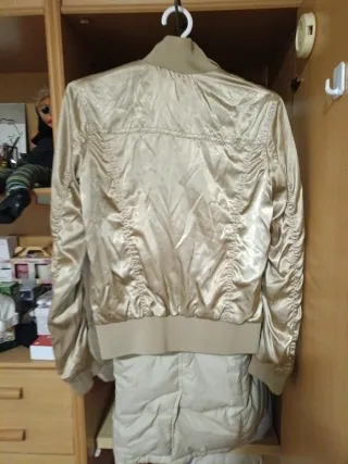 Chaqueta estilo bomber con un acabado satinado y detalles fruncidos en las mangas. - Cierre de cremallera frontal. - Bolsillos laterales con cremallera. - Cuello y puños elásticos.