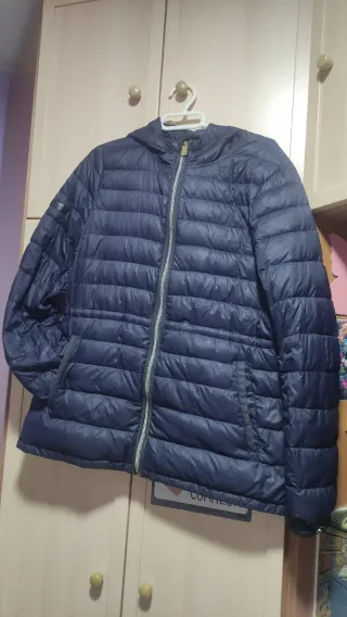 Chaqueta fina de color azul marino. Ideal para entre tiempo . No pesa nada. Muy poco usada. Talla 38-40. - Con capucha. - Detalle de pelo en la capucha. - Cierre de botones a presión.