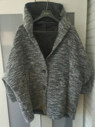 Chaqueta de punto con capucha y cierre de botones. - Diseño jaspeado en tonos grises y negros. - Corte amplio y mangas holgadas.