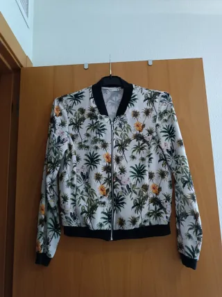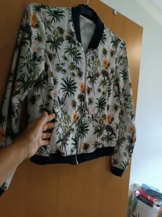 Chaqueta fina con un llamativo estampado tropical de palmeras y flores. - Diseño ligero y cómodo. - Cuello y puños elásticos negros. - Cierre de cremallera frontal. Si miras mi perfil casi todo a 1€