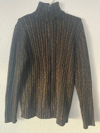 chaqueta de punto de canalé con cremallera y acabado metálico negro y dorado Talla M 📏 Envío rápido 💨 Precio negociable 🤝 Taille M 📐 Expedition rapide 💨 Prix negociable 🤝