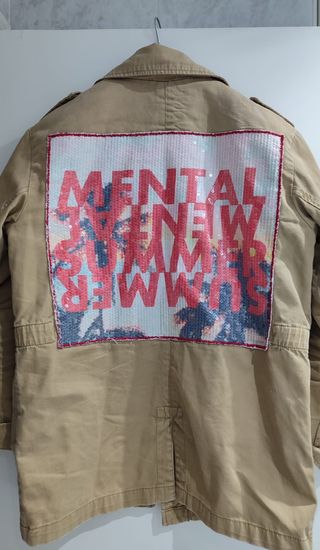 Chaqueta estilo militar de Pull&Bear con un llamativo diseño en la espalda. - Parche trasero con lentejuelas y estampado. - Diseño de palmeras y texto. - Cierre de botones.