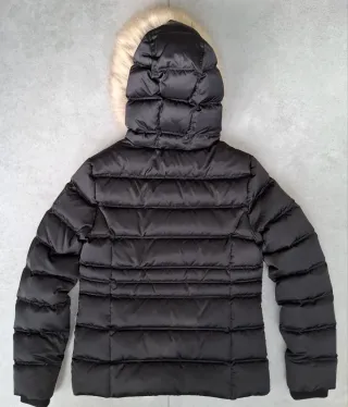 Chaqueta negra de plumas de mujer Calvin Klein de la talla L Puesta 1 sola vez ya que me queda pequeña Cremallera en los bolsillos y puño en las manaas, se desmonta el pelo de la capucha pero no la capucha. Liaeramente entallada y con un tacto superagradable. Es la talla L, pero en mi opinión talla algc pequeña. De sisa a sisa, mide 51 cm aproximadamente
