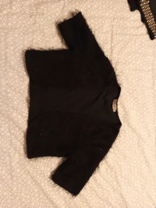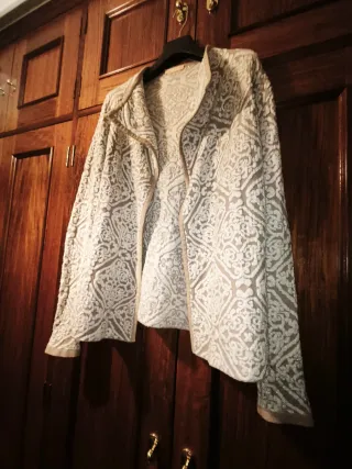 Chaqueta elegante con un diseño único, ideal para eventos especiales. Su estilo resalta por sus detalles. - Adorno de pedrería en la cintura. - Volantes plisados en cascada en la parte inferior. - Cuello con solapas satinadas y detalles plisados. El broche que lo cierra tiene un ganchito roto, pero cierra igual por eso el precio Tiene conjunto de top y falda si se compran las tres piezas todo por 30 euros. Ver armario donde está el conjunto