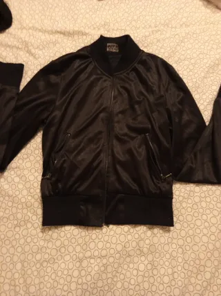 Chaqueta estilo bomber en color negro. - Cierre de cremallera frontal. - Bolsillos laterales con botón. - Detalle de bolsillo con cremallera en manga. - Puños y bajo elásticos.