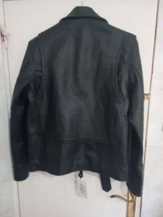 Chaqueta estilo biker en color negro. Diseño moderno y atemporal. - Material efecto piel. - Cierre de cremallera. - Cinturón con hebilla. - Bolsillos con cremallera.