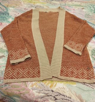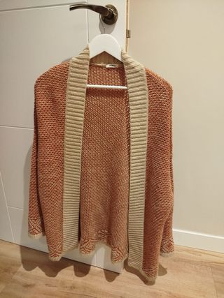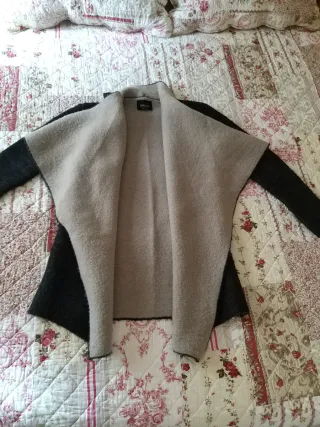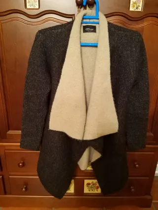 Chaqueta de punto de Zara con un diseño moderno y elegante. Combina tonos oscuros con un cuello amplio en color beige. Corte asimétrico. Largo 71-83cm. Hombro 41cm. Manga 58cm. - Diseño abierto. - Cuello amplio. - Tejido texturizado muy calentita. En perfecto estado.