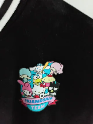 Chaqueta estilo béisbol para niña de unos 8 años, con diseño de Kuromi y personajes de Sanrio. Ideal para un look casual. - Mangas de color beige. - Cuerpo principal negro. - Cierre de botones a presión. - Bolsillos laterales. - Puños y bajo con detalles de rayas.