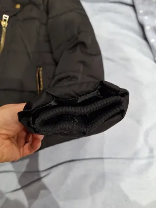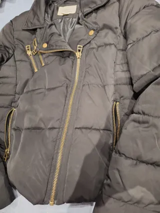 Cazadora acolchada con cremallera asimétrica y detalles metálicos. - Diseño acolchado. - Cremallera frontal dorada. - Bolsillos laterales con cremallera. Aunque se ha puesto muy poco, presenta unas manchas en el cuello,(véase última foto) tenía un cuello de pelo que no encuentro, pero se le podría poner uno.