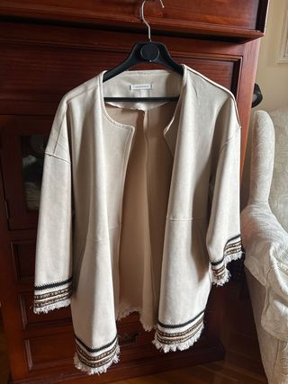 Chaqueta de antelina con un diseño moderno y detalles únicos. - Acabado en antelina. - Adornos de flecos y detalles bordados en los puños y bajo. - Corte abierto sin cierre. - Diseño con costuras marcadas.