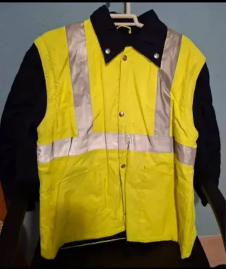 Chaqueta de trabajo con mangas negras y parte delantera amarilla de alta visibilidad. - Cierre de botones. - Dos bolsillos frontales. - Cuello alto.