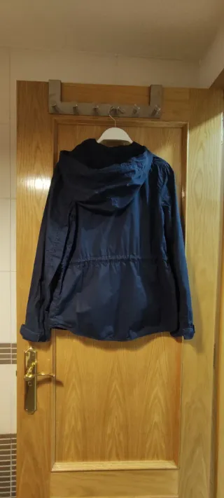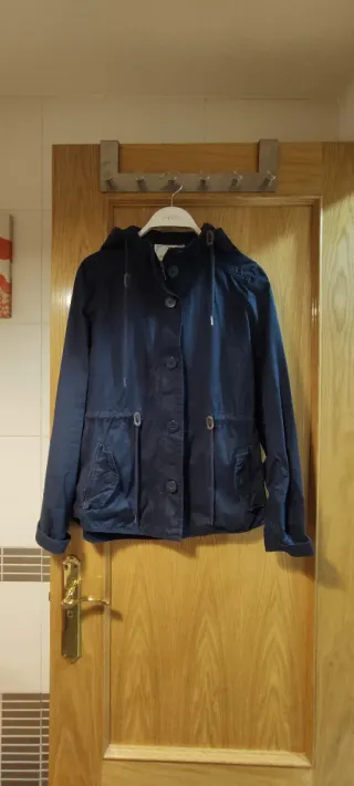 Chaqueta ligera de color azul, ideal para entretiempo. Presenta un diseño moderno con capucha y cierre de botones y cremallera. Está en perfecto estado. - Capucha ajustable con cordones. - Bolsillos frontales con corchetes - Cordón de ajuste en la cintura.