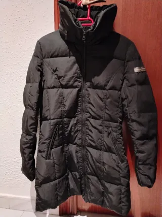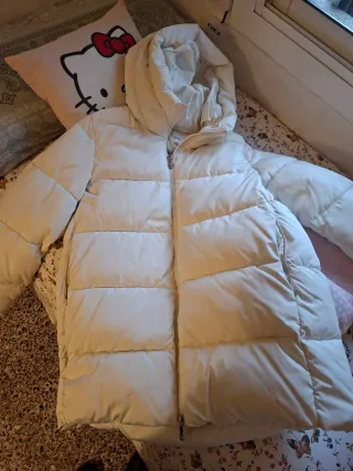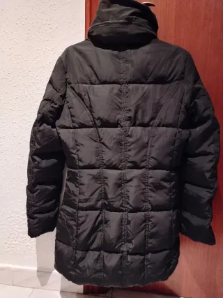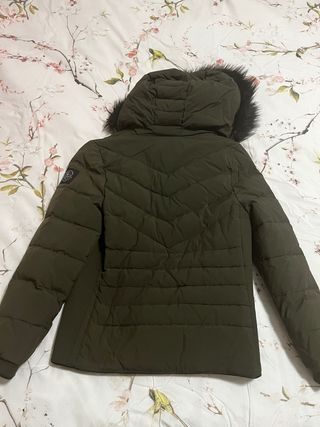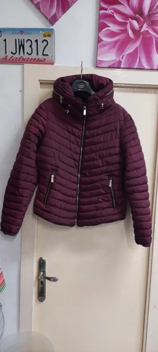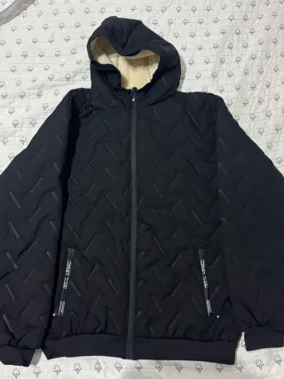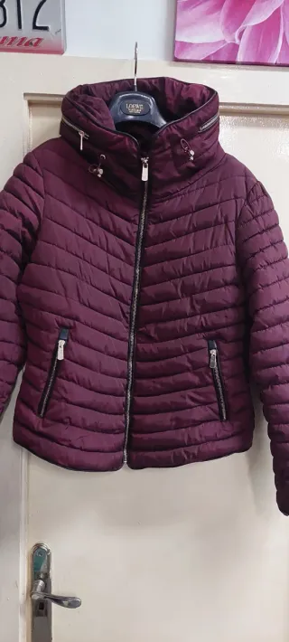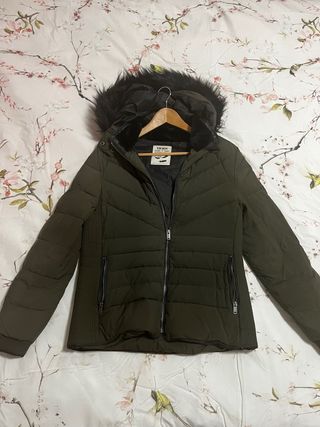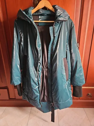 Chaqueta acolchada de color verde petróleo con acabado ligeramente brillante, ideal para otoño e invierno. Cuenta con capucha integrada, cierre de cremallera, y puños elásticos que ayudan a mantener el calor. Diseño cómodo y moderno, con bolsillos laterales y un corte que cubre bien la cadera. Está en muy buen estado, poco uso, sin roturas ni manchas. Abriga bien y es ligera a la vez, perfecta para el día a día.