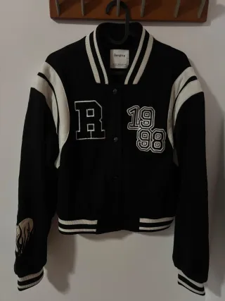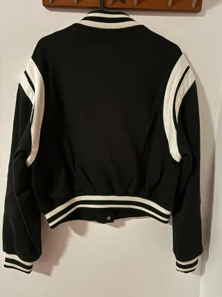 Chaqueta tipo bomber de Bershka. - Diseño en color negro y blanco. - Detalle de letras y números bordados. - Puños y cuello elásticos. Se entrega en Badalona, los envíos los hago a través de wallapop por la agencia de Correos