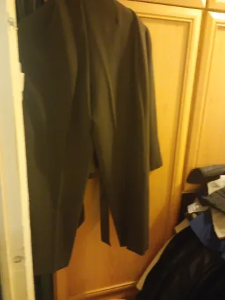 Conjunto de chaqueta y pantalón. - Chaqueta con cinturón. - Diseño abierto.