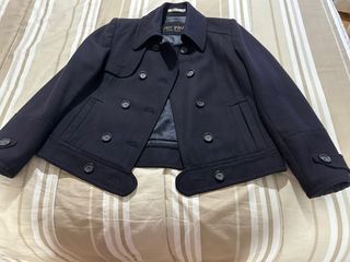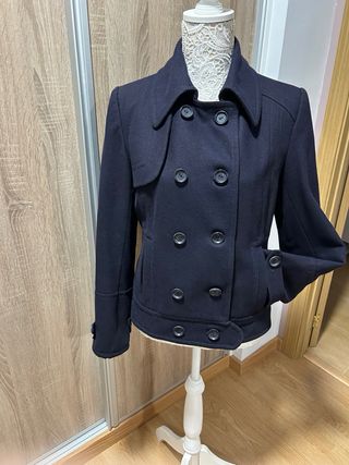 Chaqueta de corte militar de Zara. - Diseño de tres cuartos. - Doble abotonadura delantera con botones dorados. - Cuello con detalle de abalorio, encaje. - Puños con botones dorados puesto 2 veces