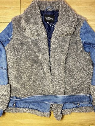 Chaqueta estilo teddy con borreguito y detalles en denim. Un diseño original y moderno. - Combinación de tejido suave y denim. - Cierre con cinturón de tela. - Cuello amplio.