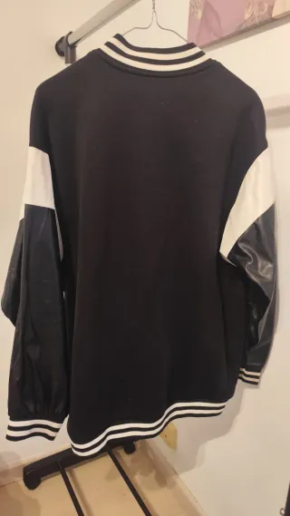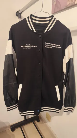 Chaqueta estilo bomber con un diseño moderno. - Mangas blancas y cuerpo negro. - Puños y cuello a rayas blancas y negras. - Cierre de botones a presión. - Bolsillos laterales. - Inscripciones decorativas en el pecho.