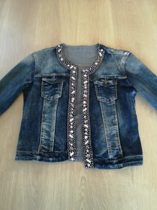 Chaqueta tejana con un diseño único y detalles que la hacen especial. - Cuello redondo con adornos. - Cierre de cremallera. - Bolsillos delanteros con solapa. - Mangas largas.