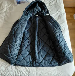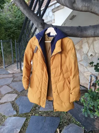 Chaqueta de abrigo en tonos mostaza y azul. Se encuentra en buen estado. - Diseño acolchado. - Cierre de cremallera y botones. - Capucha integrada.