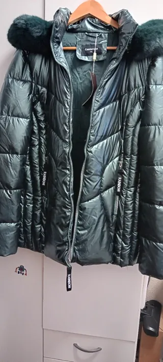 Chaqueta de invierno en color verde, muy calentita y con capucha. - Detalle de pelo sintético en la capucha. - Cremalleras doradas. - Bolsillos con ribete negro. - Puños y bajo con detalle en polipiel negra.