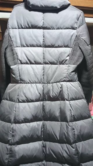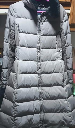 Chaqueta larga de Armani en color gris, con un diseño acolchado y detalles de punto en las mangas. Se encuentra en perfecto estado, usada una sola vez. - Cierre de cremallera frontal. - Cuello con acabado de pelo sintético. - Bolsillos laterales con cremallera. Realmente la es talla más grande, pero talla pequeño, queda precioso en la parte de la cintura.